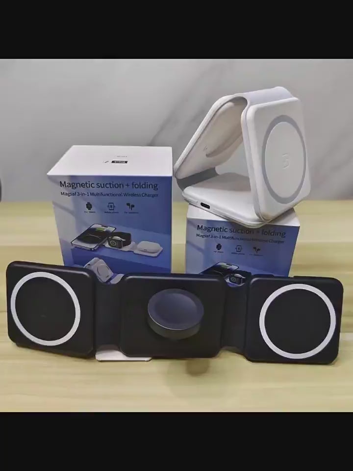 Product Name: 3 in 1 Magnetic Foldable MagSafe Wireless Charger for iPhone 16 to 12 Series Package Contains: It has 1 piece of MagSafe Wireless Charger Material: Plastic Product Dimension: 8 x 3 x 8 cm Color: As Per Availability Additional Information: 3 in 1 Magnetic Foldable MagSafe Wireless Charger for iPhone 16 to 12 Series | Compatible with AirPods 2/3/Pro | Compatible with only Apple Watch Series | Wireless Charger. Compatible with iPhone 16, iPhone 15, iPhone 14, iPhone 13, iPhone 12 and their Pro, Pro Max and Plus Versions. Not compatible with iPhone 15 Pro Max. Only Compatible with Apple Watch Series 4, 5, SE, 6, 7, 8, 9, 10, Ultra, Ultra 2 (Does not support charging for Samsung Watch Series or other brand smart watch) Weight: 200 gm